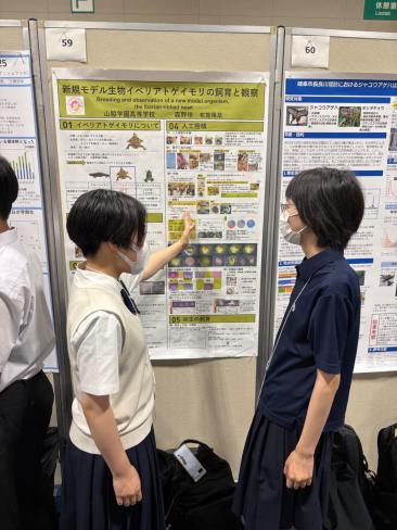 高校2年生はイベリアトゲイモリの飼育と観察、高校1年生はオオイタサンショウウオの幼生の成長についての発表を行いました。動物学の研究に携わる多くの方々からコメントやアドバイスをいただき、今後の糧となりました。また、8月の鳥取での研修で共に学んだ他校の生徒とも再会し、お互いの研究成果について議論を深めることができました。