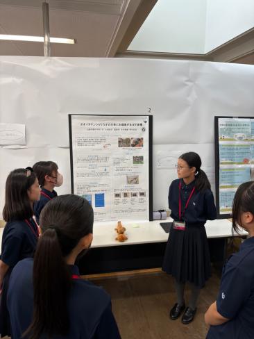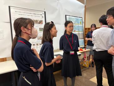 最初に東邦大学の村本哲哉先生より研究倫理についての講義があり、その後はパートに分かれてポスターセッションが行われました。中学1年生は研究活動を始めたばかりではありますが、高校生の中に入って元気にハキハキと発表を行い、質問にもしっかりと受け答えができていました。また、発表以外の時間は他の発表を興味津々に聞き、質問したり参考になるところをメモしたりといった積極的な姿勢がみられました。