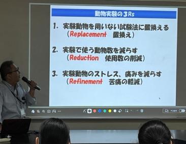 今回は実験計画書を提出しようとしている生徒30名が講習を受けました。実験動物とは何か、動物実験計画書の作成について、研究倫理・生命倫理とは何かについて学びました。