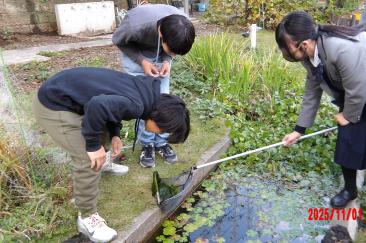 屋外実験場の池の生物観察