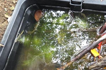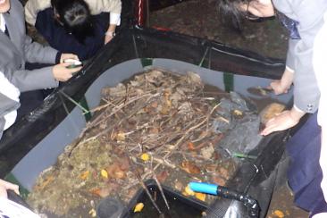 ビオトープ班活動 屋外予備実験場へのサンショウウオ幼体放流