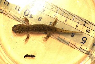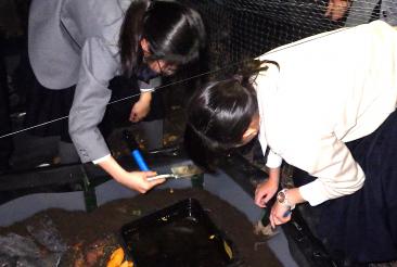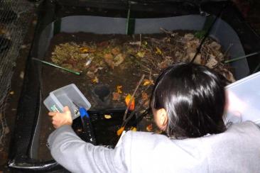 放流用に生き餌を捕獲して食べる訓練をした幼体は12匹。個体識別用に一匹ずつ背面の模様のプロファイル写真を作成し、二日間にわたって6匹ずつミスト無し区画Aとミスト設備付き区画Bの水鉢の中に放流しました。生徒達が見守る中、幼体達はしばらく水鉢の水中にとどまっていましたが1日近くかけて徐々に陸へと上がっていきました。
